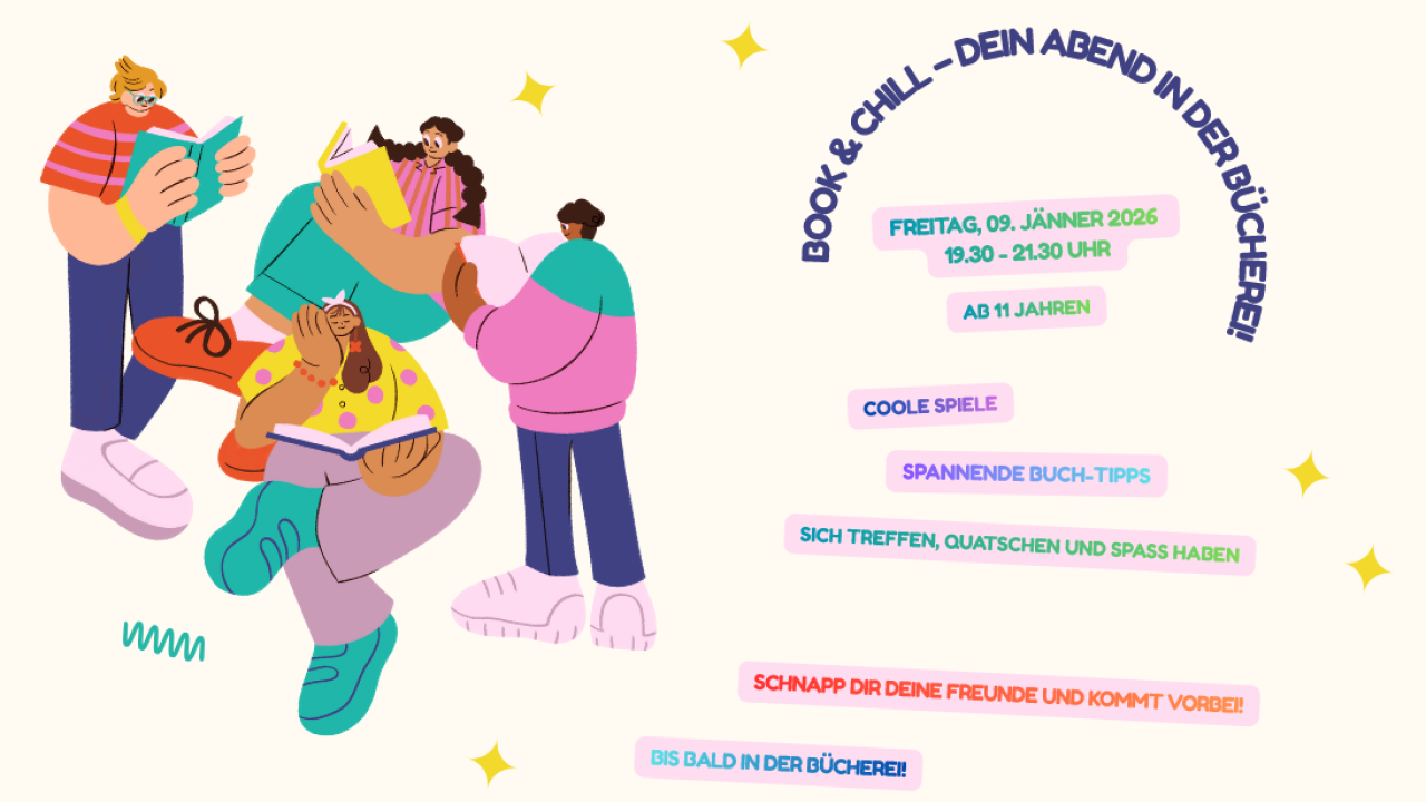 Book & Chill – dein Abend in der Bücherei - am Freitag, den 9. Jänner 2026 von 19:30 – 21:30 Uhr für 11–15 Jährige – spannende Buch-Tipps, coole Spiele, sich treffen, quatschen und Spaß haben – lasst euch überraschen!
